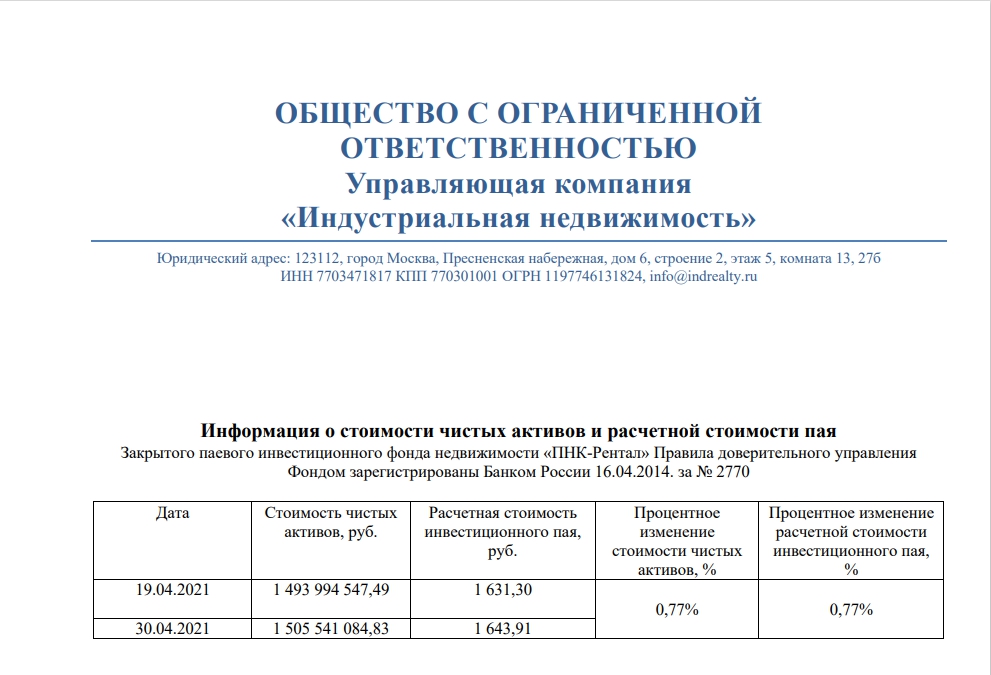 2.1. Инвестиционные паи закрытого паевого инвестиционного фонда недвижимости "ПНК-Рентал" под управлением Общества с ограниченной ответственностью Управляющей компании "Индустриальная недвижимость", регистрационный номер правил доверительного управления – 2770 от 16.04.2014, торговый код – RU000A1013V9.